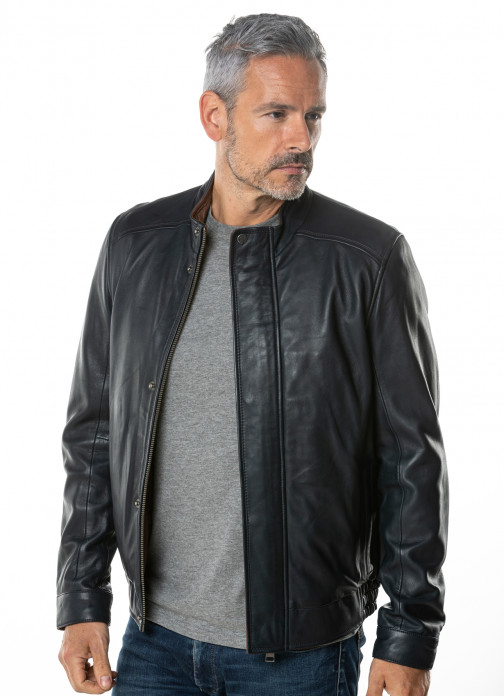 SWINSIDE LEATHER BOMBER JACKET IN NAVY
